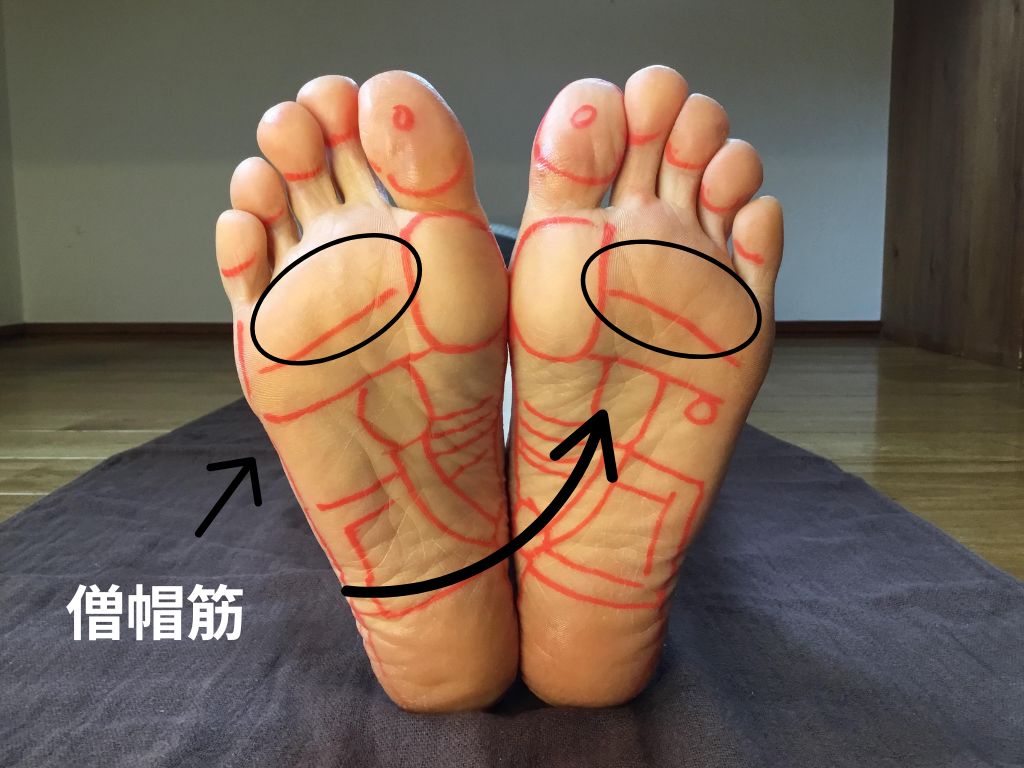- 左足には左側の僧帽筋ゾーン、右足には右側の僧帽筋ゾーンが対応。