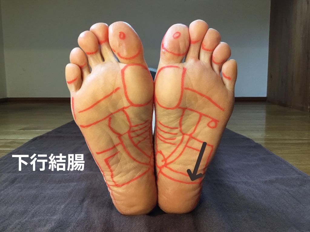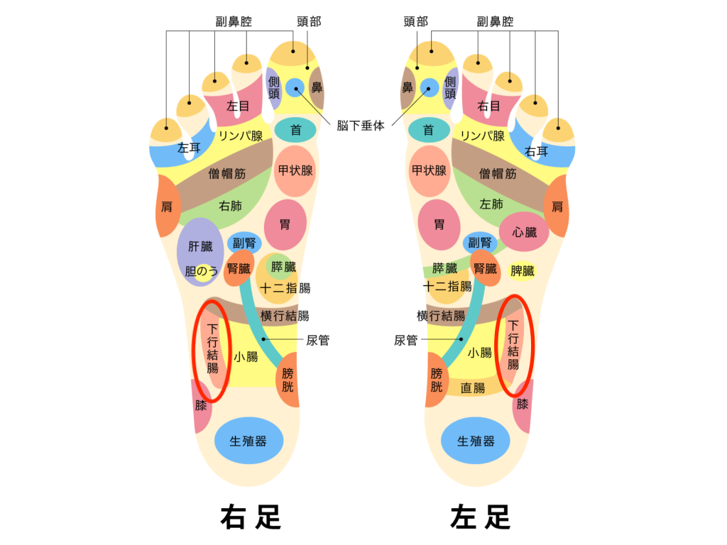 • 下行結腸の反射区は基本的に左足のみにあります。