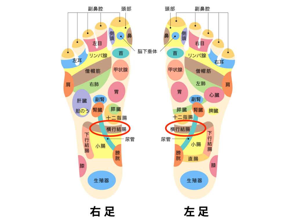 • 横行結腸は左右にまたがる臓器のため、両足ともに反射区があるが、硬さに差が出ることが多い